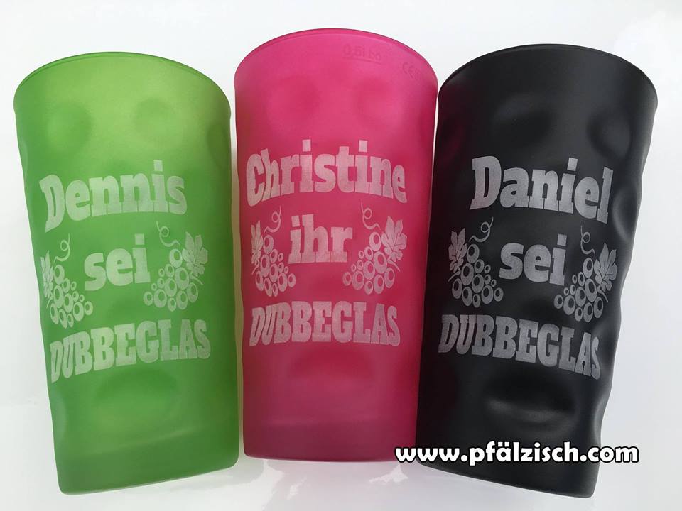 Was darf auf keinem Weinfest fehlen? Richtig! - Das original Dubbeglas aus der Pfalz! In unserem Dubbeglas Shop findest du nicht nur eine große Auswahl an farbige Dubbegläser, Dubbebecher und Dubbetassen, sondern hast zudem die Möglichkeit, ganz nach deinen Wünschen, dein persönliches Dubbeglas gravieren oder bedrucken zu lassen. Ob, Name, Firmenlogo oder Pfälzer Sprüche - Deiner Kreativität sind keine Grenzen gesetzt! Selbstverständlich kannst du nicht nur farbige Dubbegläser bei uns gravieren lassen, auch die original Pfälzer Schoppengläser, Weingläser, Biergläser und Sektgläser werden durch deine persönliche Gravur oder Aufdruck zu einem echten Unikat! Gib dich nicht mit irgendeinem Schorleglas zufrieden - gestalte dein eigenes, neues Lieblingsglas!